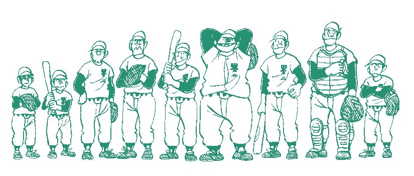 表紙カバーをとった表紙のナインの姿を載せました。名前は左から順に松尾、慎二、牧野、佐藤、曽根、近藤、久保、小室、イガラシです。(2010年 4月30日)(Oz)